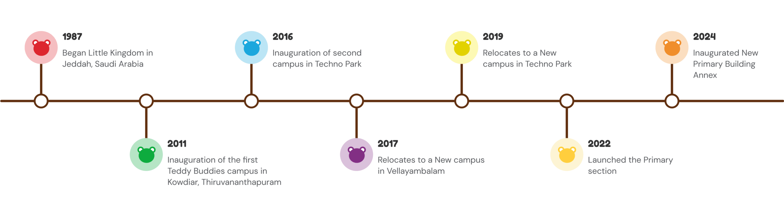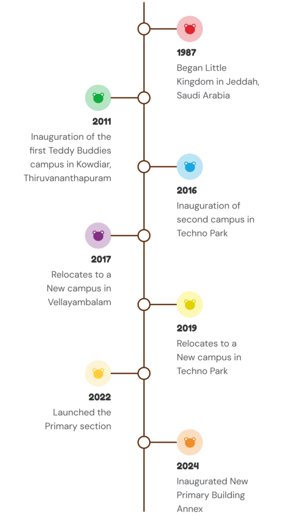Established in 1987, TEDDY BUDDIES, formerly known as Little Kingdom, was created out of a passion to provide children with a stimulating and enriching early childhood experience in Jeddah. We moved to India in 2011 and started our first preschool in Trivandrum, Kowdiar. To meet the growing demand for preschools in and around Technopark, we launched our second center near Technopark in 2015.